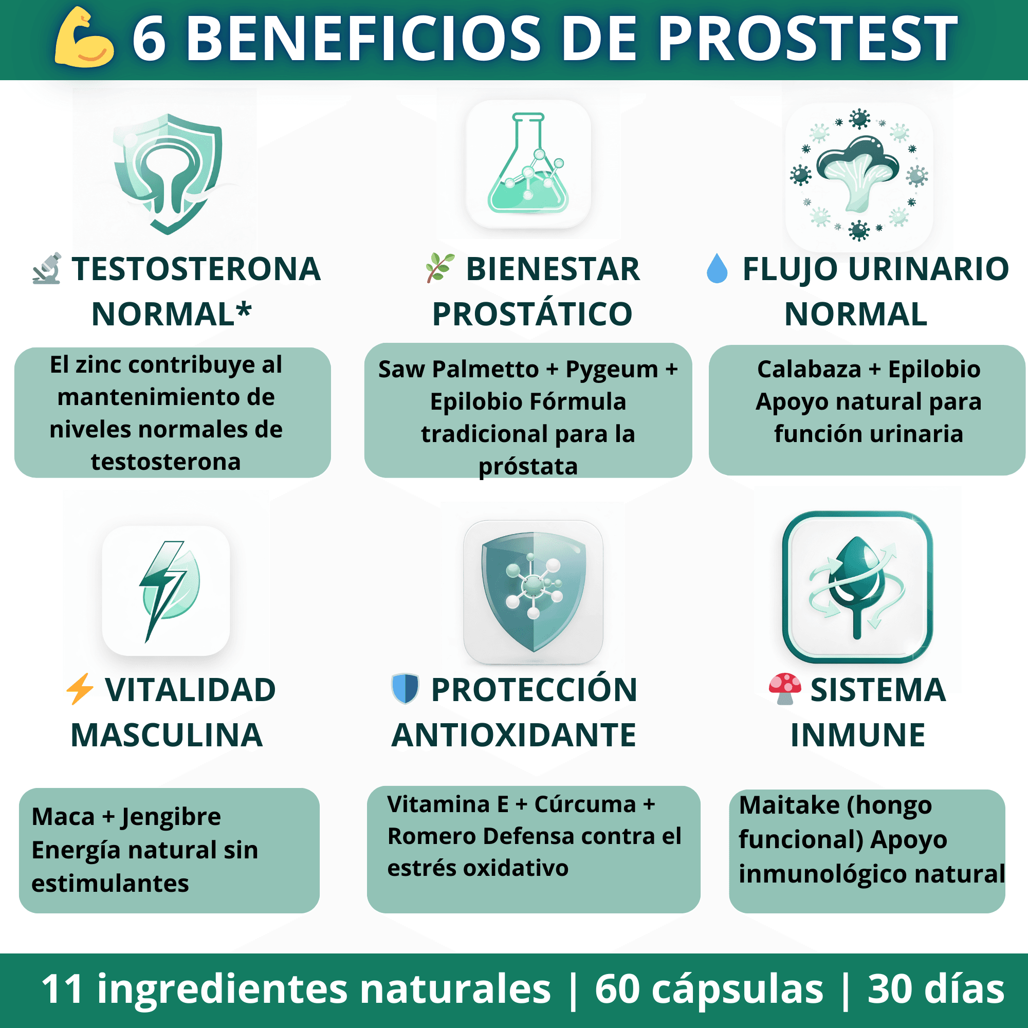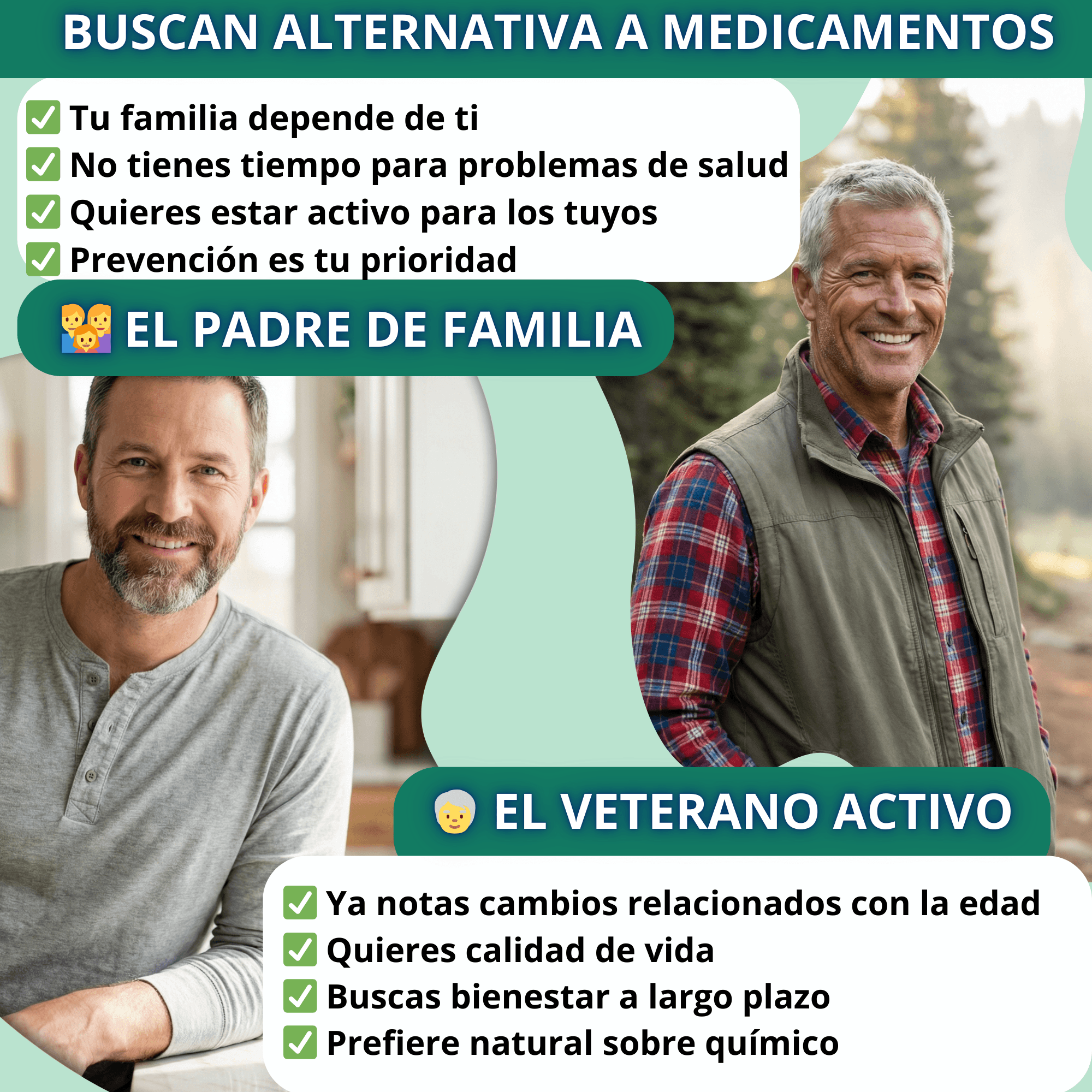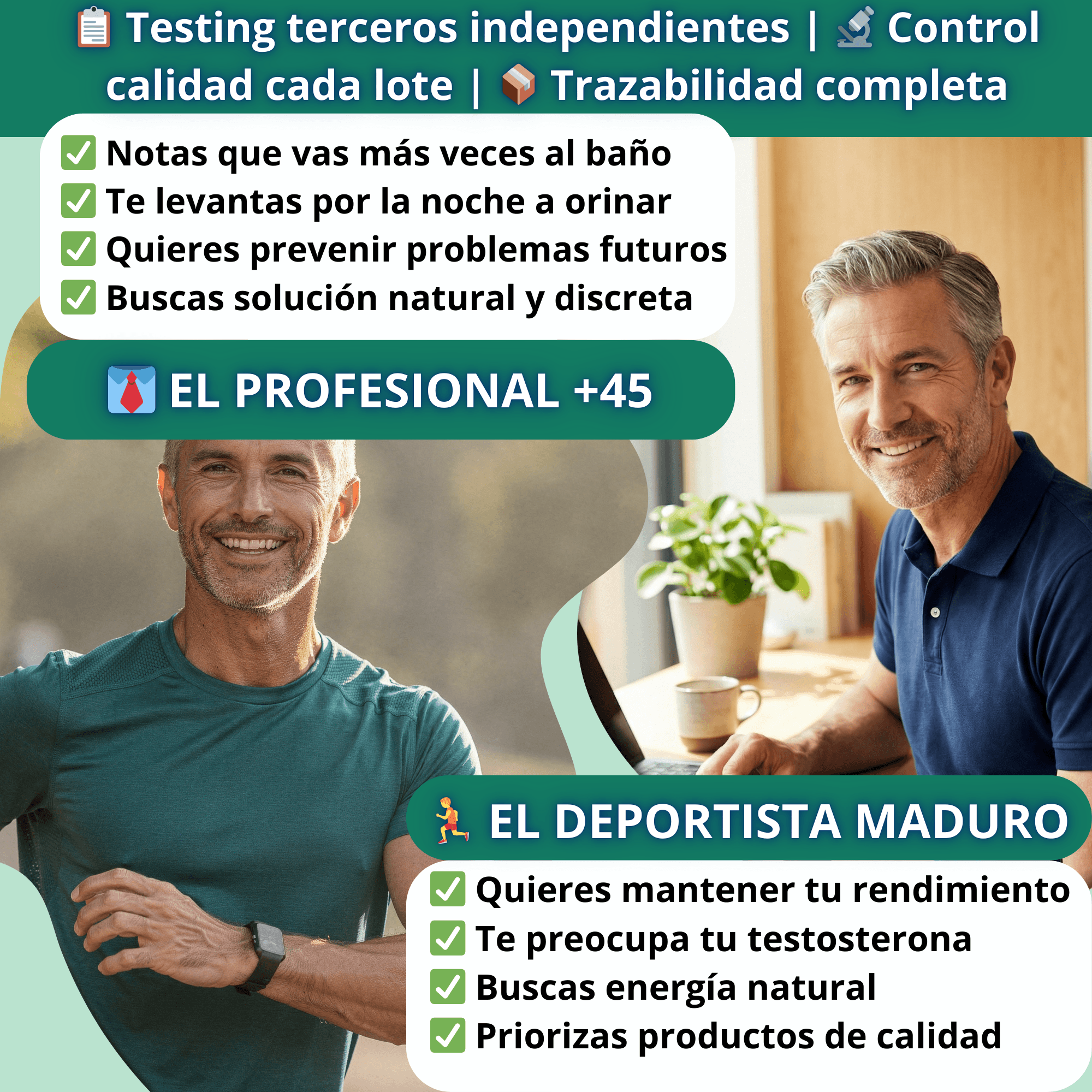 ❌ Te levantas una o dos veces por la noche para ir al baño y eso empieza a afectar tu descanso. ❌ Notas que el chorro es más lento o que nunca terminas de vaciar la vejiga del todo. ❌ La energía y la vitalidad que tenías a los 35 ya no son las mismas y lo notas cada día. ❌ Sabes que deberías cuidar tu próstata pero no sabes qué tomar o no confías en los suplementos genéricos. ❌ Has visto productos con un solo ingrediente (solo Saw Palmetto) y no te convencen como solución completa.