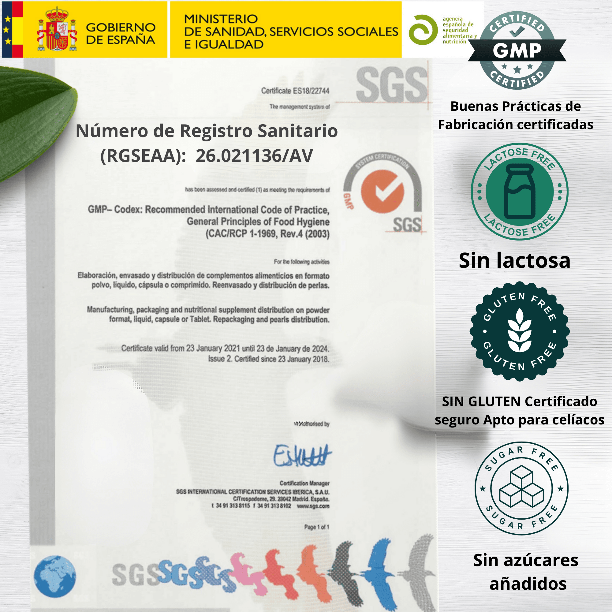 Maitake, Jengibre, Cúrcuma, Romero y Vitamina E completan una fórmula con propiedades antioxidantes y adaptógenas. Fabricado en España bajo certificación GMP. Libre de alérgenos declarados, sin GMO. Transparencia total en cada etiqueta.