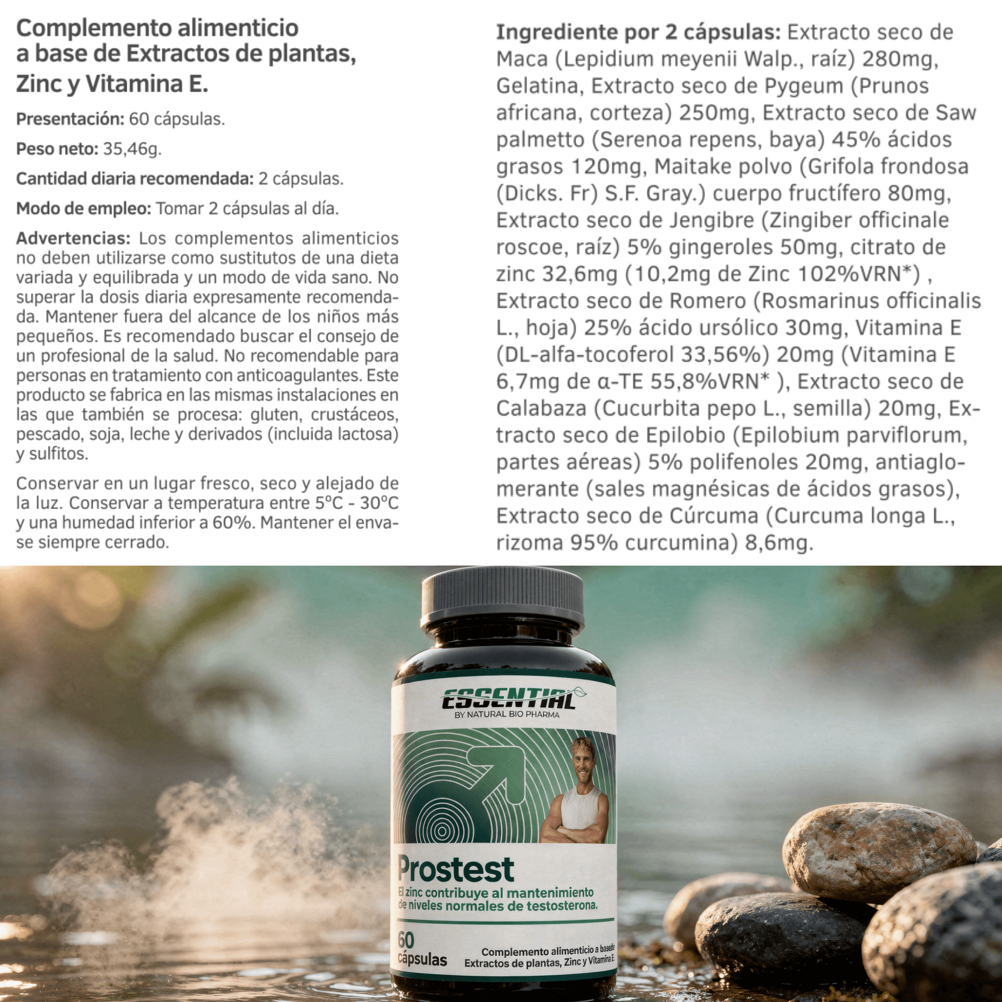 Maca, Pygeum, Sabal, Zinc y 7 ingredientes más en sinergia. Salud prostática, confort urinario y vitalidad masculina en un solo suplemento. Sin atajos, sin rellenos, con transparencia total.