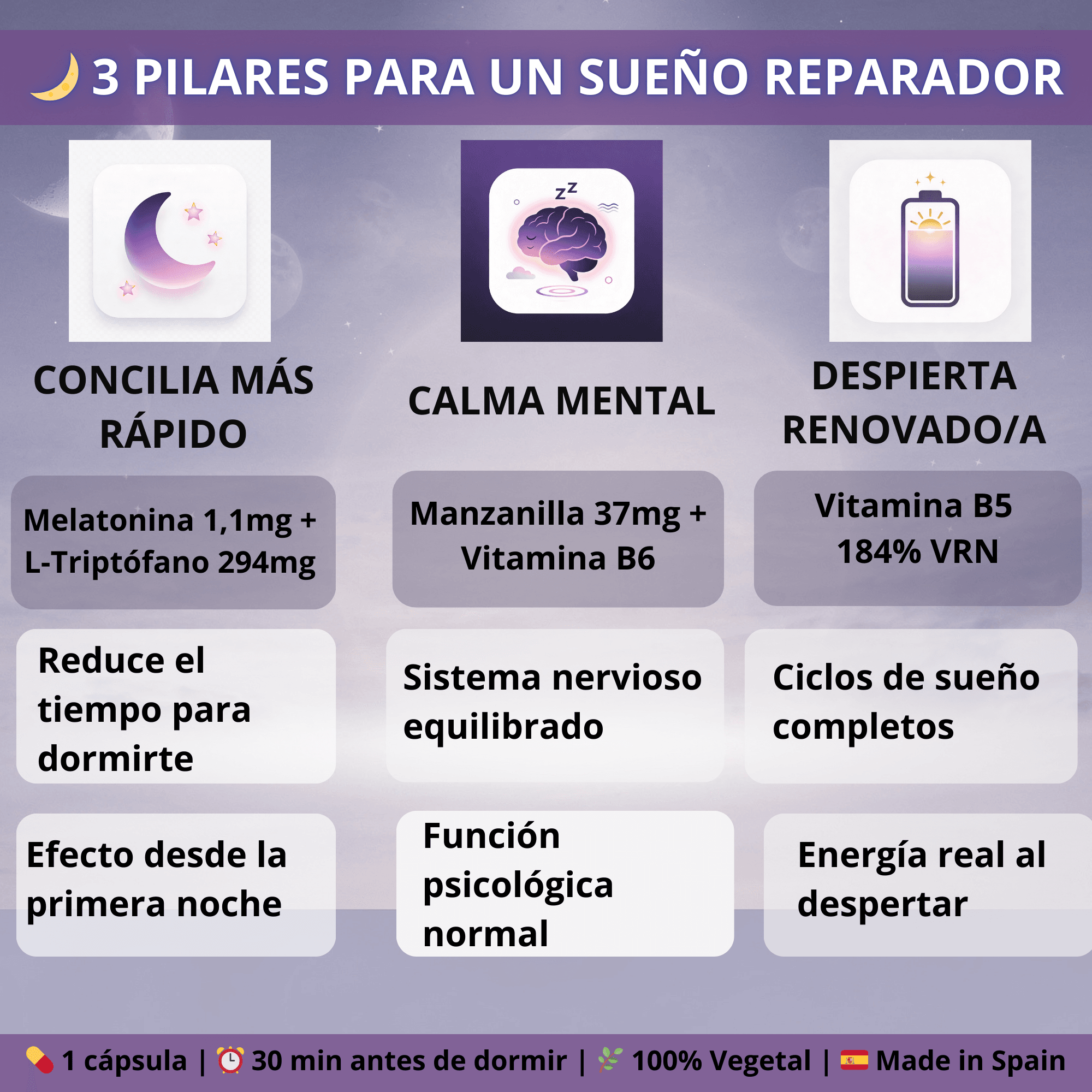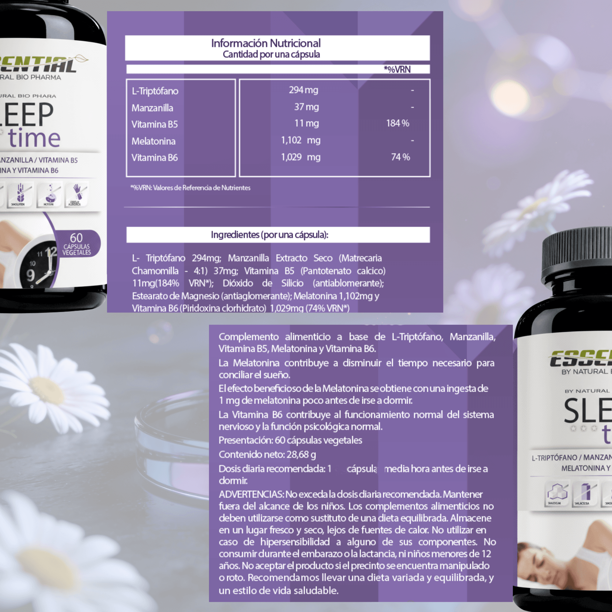 La melatonina básica es solo 1 pieza. Sleep Time añade L-Triptófano (ayuda a tu cuerpo a producir su propia melatonina), Manzanilla con apigenina (calma la mente hiperactiva), Vitamina B6 (cofactor esencial de la conversión) y B5 (gestión del estrés que interfiere con el sueño). Un sistema completo, no un parche.